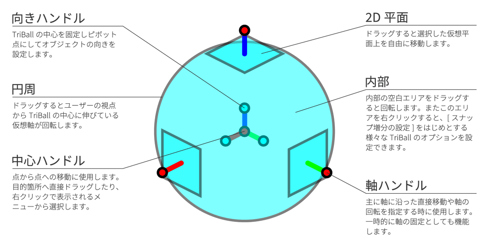 シェイプ / パーツ / アセンブリ / TriBall 本体 / 断面図形 / 3D 曲線 / サーフェス / 結合点 / 面 / ライト / カメラ / テクスチャ / 輪郭 / 切断面 / アニメパス等